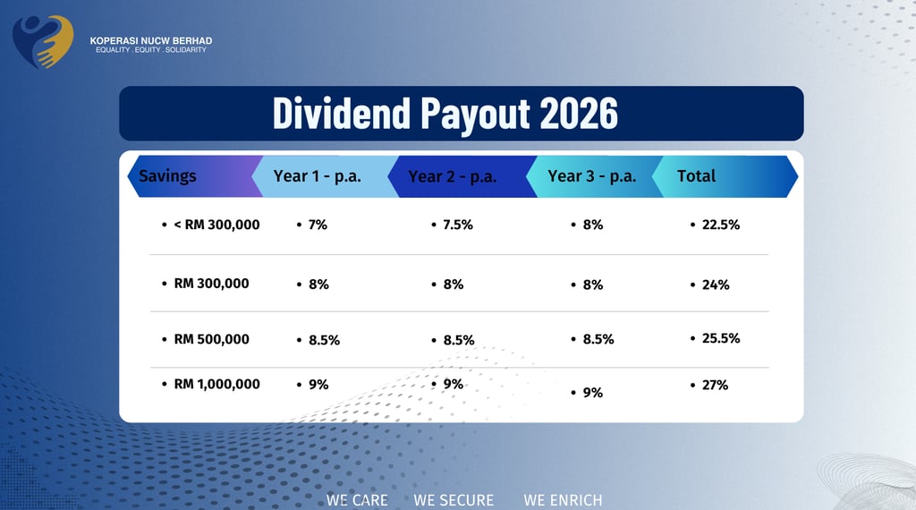 Ranked among the Top 30 cooperatives in Kuala Lumpur, Koperasi Kesatuan Kebangsaan Pekerja-Pekerja Perdagangan Berhad(NUCW) offers investors a proven track record of governance, transparency, and Shariah-compliant growth — backed by regulatory oversight and collective strength.